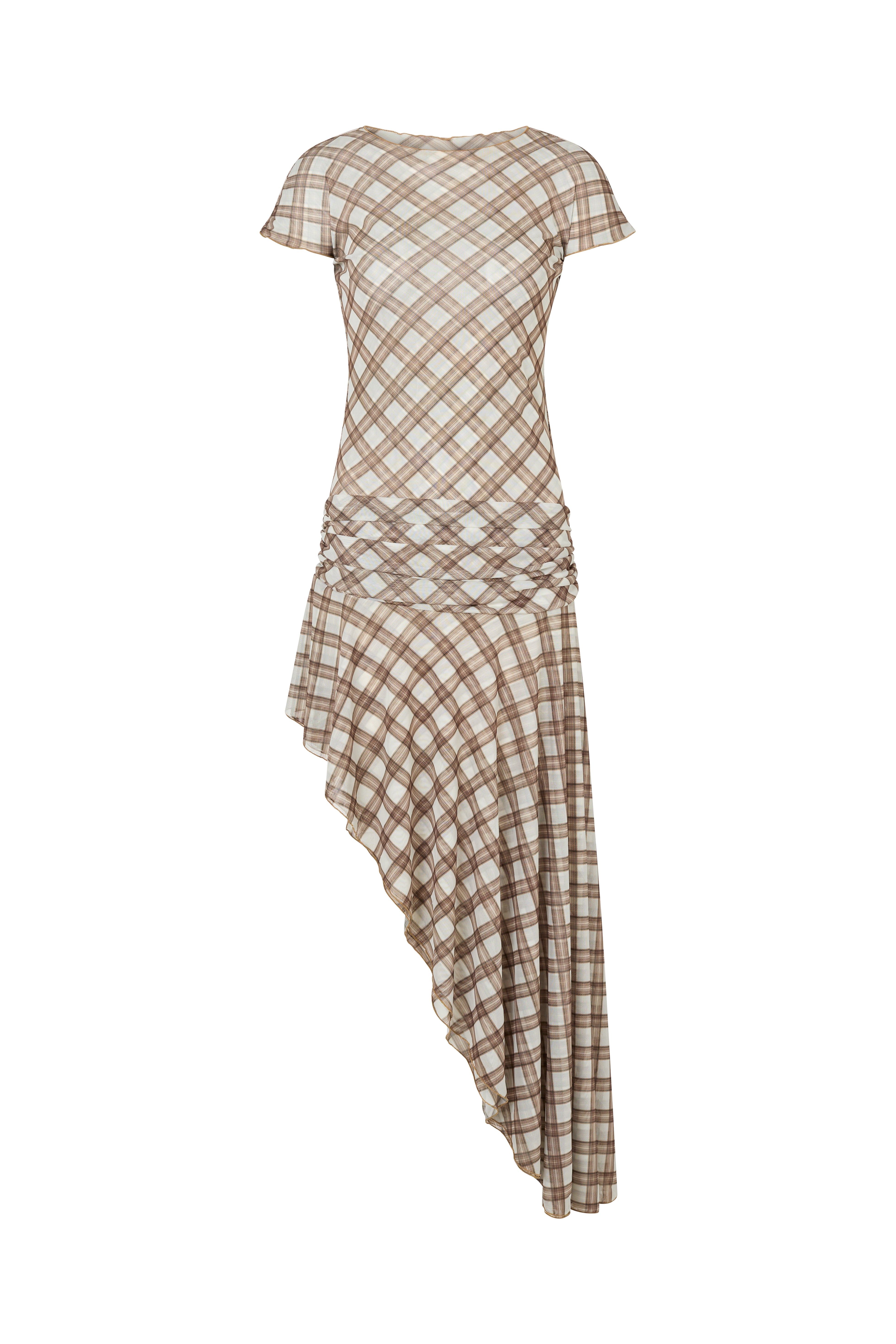The Amour Slip Short Sleeve is a fluid, asymmetrical dress that balances softness with a sharp, modern edge. Cut from lightweight printed mesh, it skims the body with an easy, elongated drape, while the gathered side detailing shapes the waist without feeling fitted. The soft shoulder and short sleeve give the silhouette a relaxed refinement, contrasted by the asymmetric hem that moves with a quiet sense of drama. Effortless, sculptural, and unmistakably contemporary.