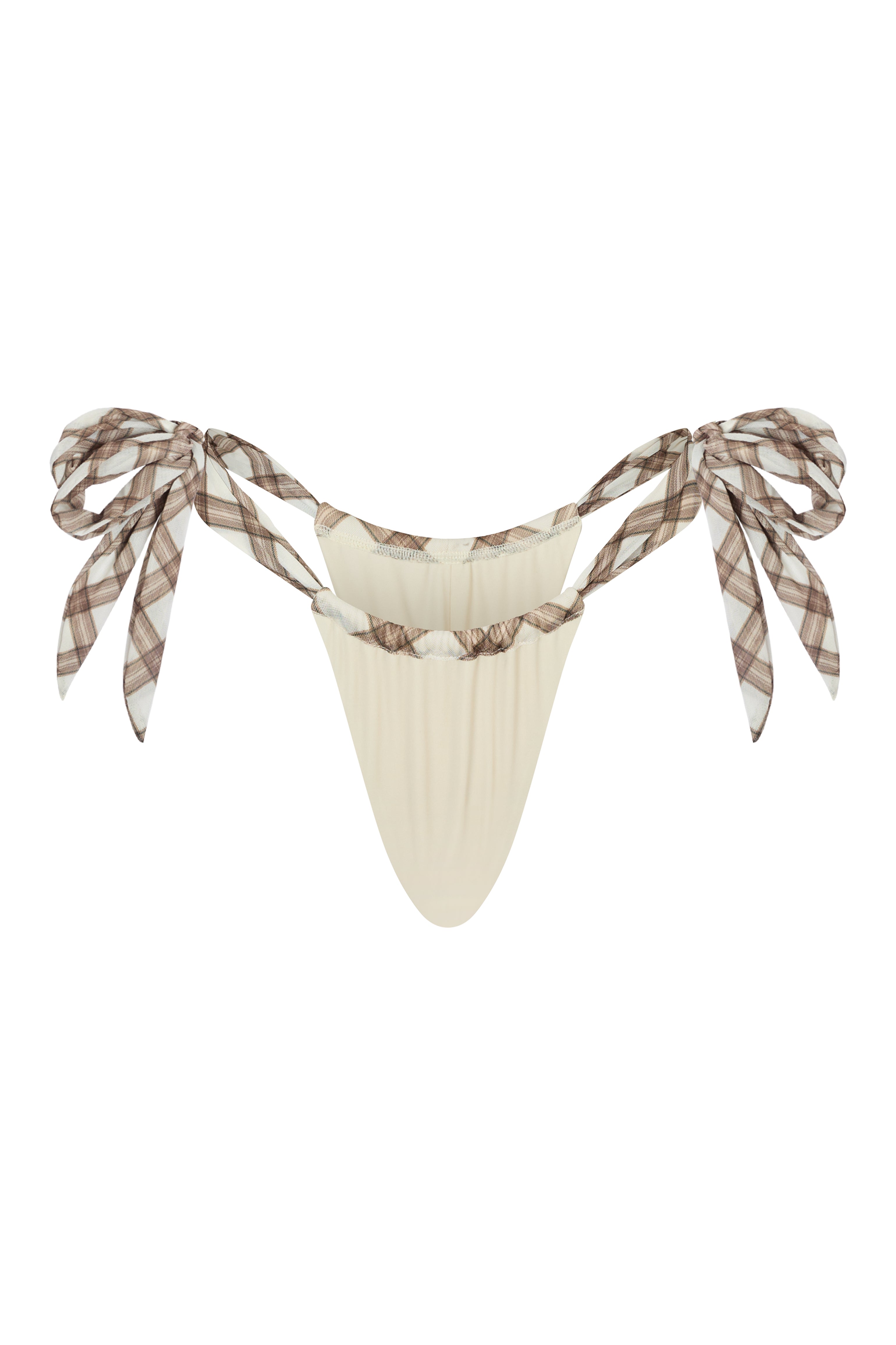 The Hot Mess Bottom reimagines the tie-side silhouette with a softer, more sculpted approach. A gently ruched front panel creates a refined drape, meeting a clean inner layer that gives the style its smooth, elongated shape. The double side straps sit lightly on the hips, finished with oversized mesh ties that add movement without overwhelming the design. The result is a bottom that feels playful yet polished.
