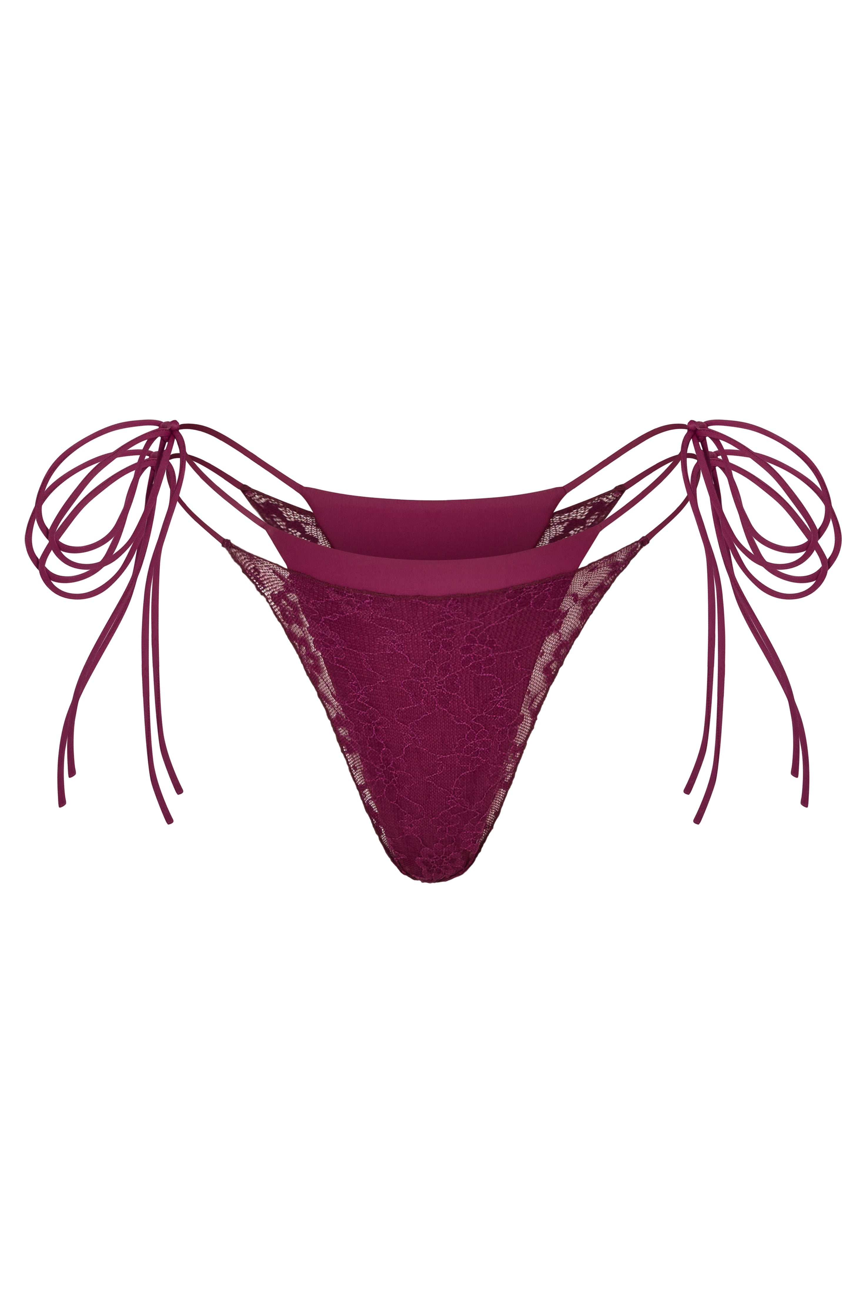 The Midnight Tie Bottom is designed with a distinctive double layer effect that gives the silhouette a refined, modern edge. The sheer lace mesh sits softly over a clean inner base, creating a subtle contrast that highlights the curves without feeling loud. Cut with a slightly dipped front and adjustable ties, it flatters the hips beautifully and allows you to customize how high or low it sits. Lightweight, sculpting, this is a bottom that elevates the classic tie side shape.
