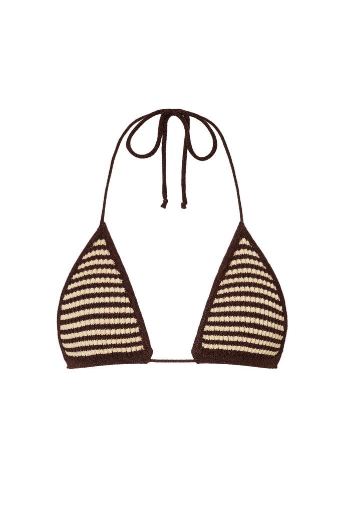 The Ye Top is your minimalist essential for swim or slow-day lounging. Crafted from a soft, stretchy knit with subtle texture, it offers a sleek flattering triangle shape, while adjustable ties at the neck and back allow for a custom fit. The clean lines and contrast trim create a modern, feminine finish. Perfect for spa days, slow swims, or layered under open knits for a cozy twist on classic swimwear.