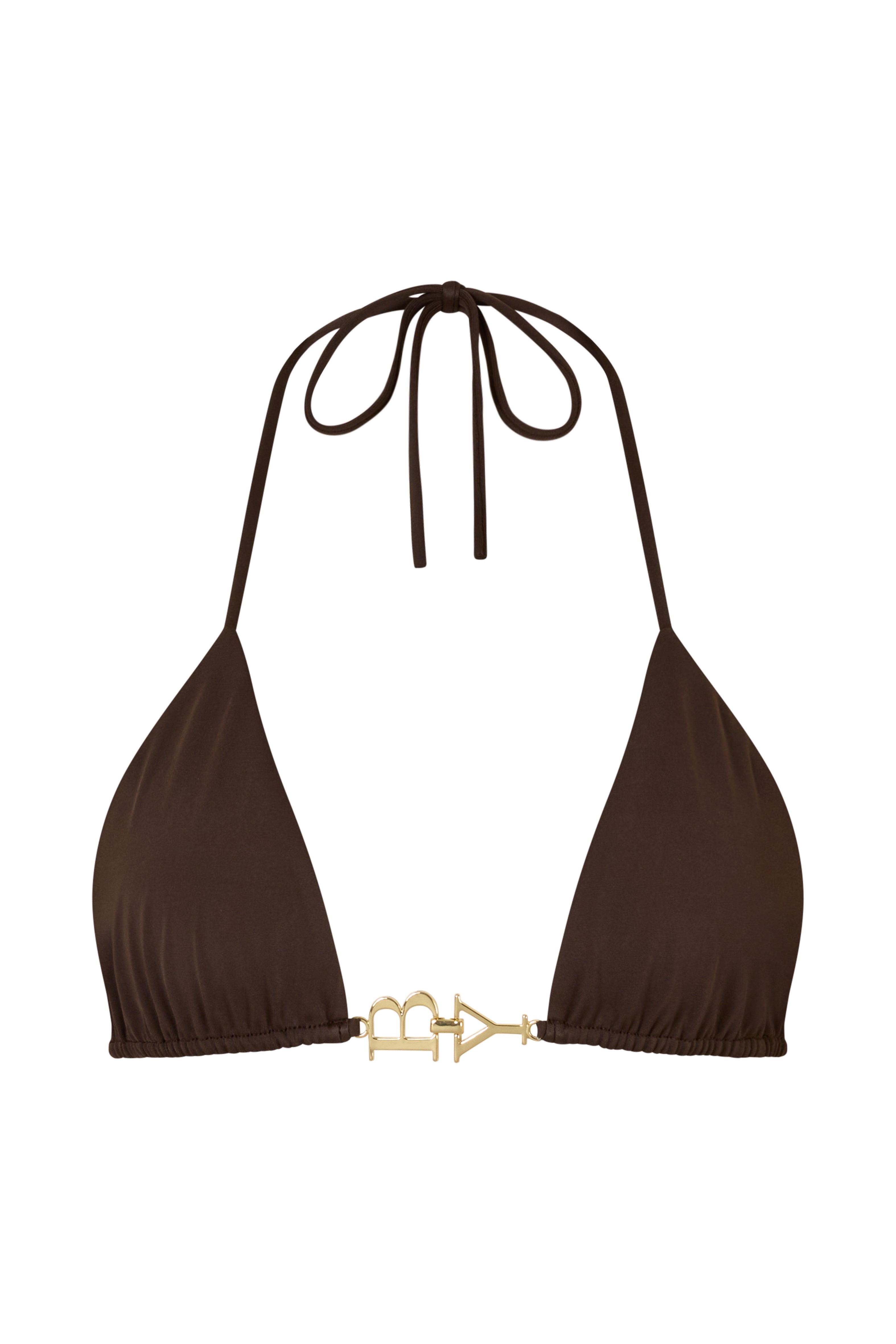 The Bisou Top is a playful take on the classic triangle, refined through a lingerie-inspired lens. Cut small and precise, it features soft sliding cups, finished with our gold statement BY clasp at the center early-2000s glamour. Delicate neck and back ties allow you to adjust the fit with ease, while the removable padding offers flexible shaping depending on how you choose to wear it. Sweet, confident, and unmistakably Bayu.