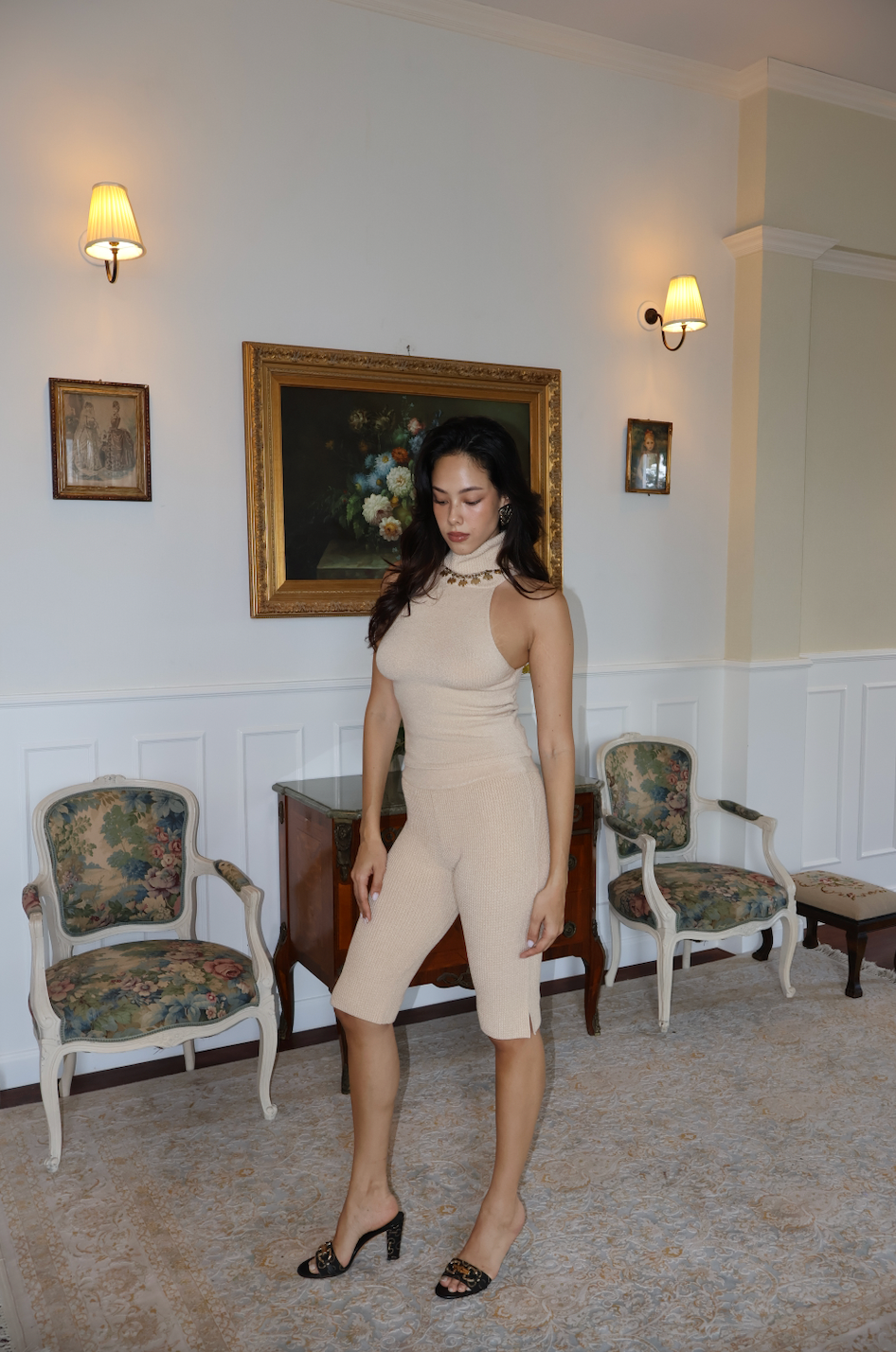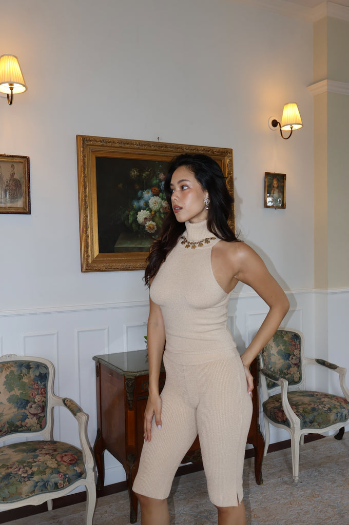 The Rumi Top is the definition of effortless polish. A sleek halter neck knit with a soft, fold over turtleneck, it balances minimal design with a feminine edge. Crafted from a smooth, stretchy ribbed fabric, it hugs the body beautifully while staying soft and breathable. The cropped, body-skimming fit highlights the shoulders and waist, perfect for layering under blazers or styled with the collection’s matching pieces for an effortless head to toe look. Easy, elegant, and endlessly wearable, Rumi is the knit that elevates every outfit.