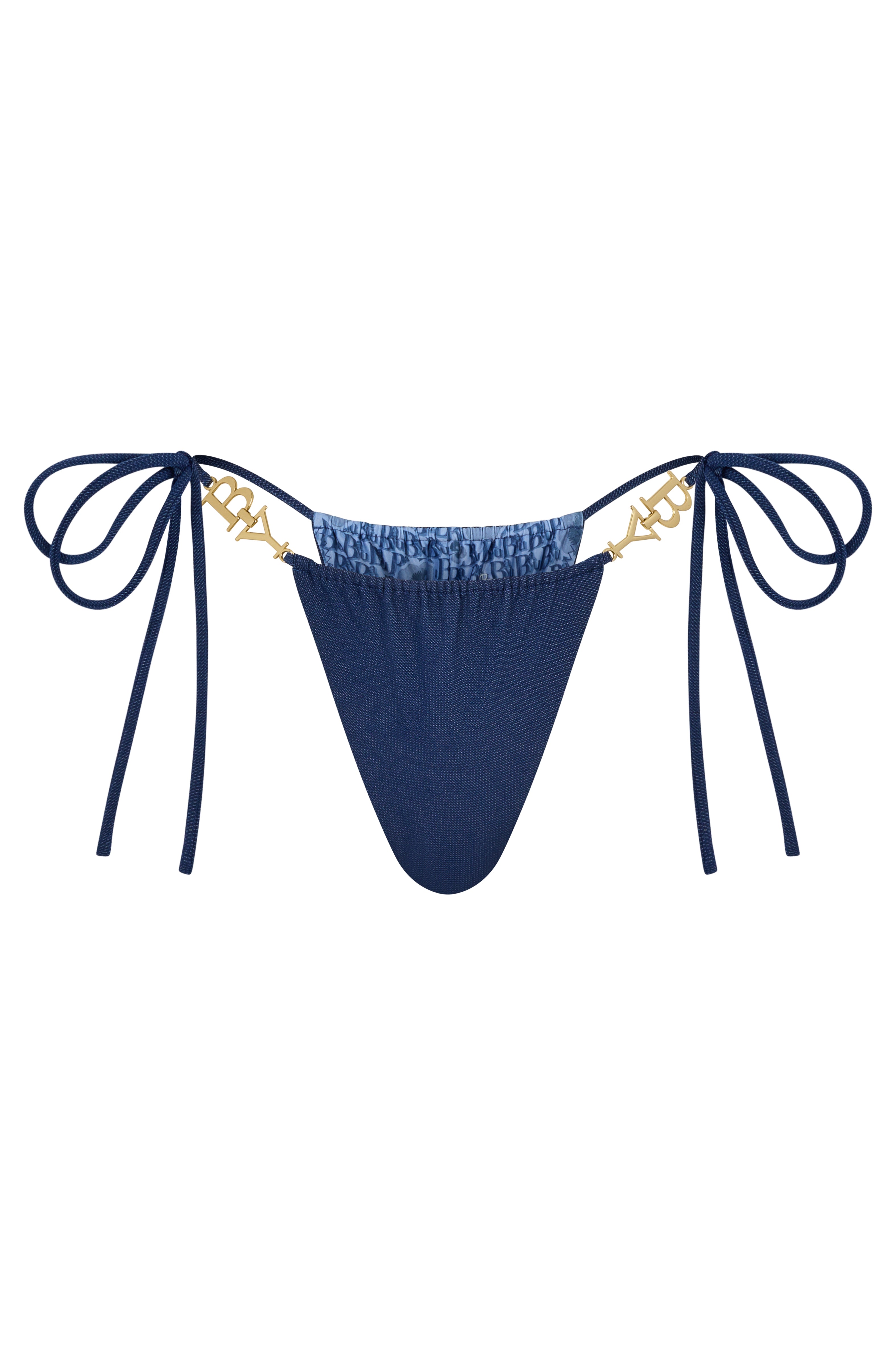 The Belle Bottom in Vintage Denim is a minimal side-tie silhouette, elevated through proportion and detail. Featuring textured denim-look outer fabric with smooth signature printed lining, this bottom is designed to sit clean on the hips, creating a long, uninterrupted line that complements the leg. Fine adjustable ties frame the body lightly, finished with our gold statement BY detail, a signature accent that brings a subtle sense of polish and distinction. Feminine and confident, Belle is a styling piece as much as it is swimwear, designed to mix effortlessly across the JE T’AIME collection.
