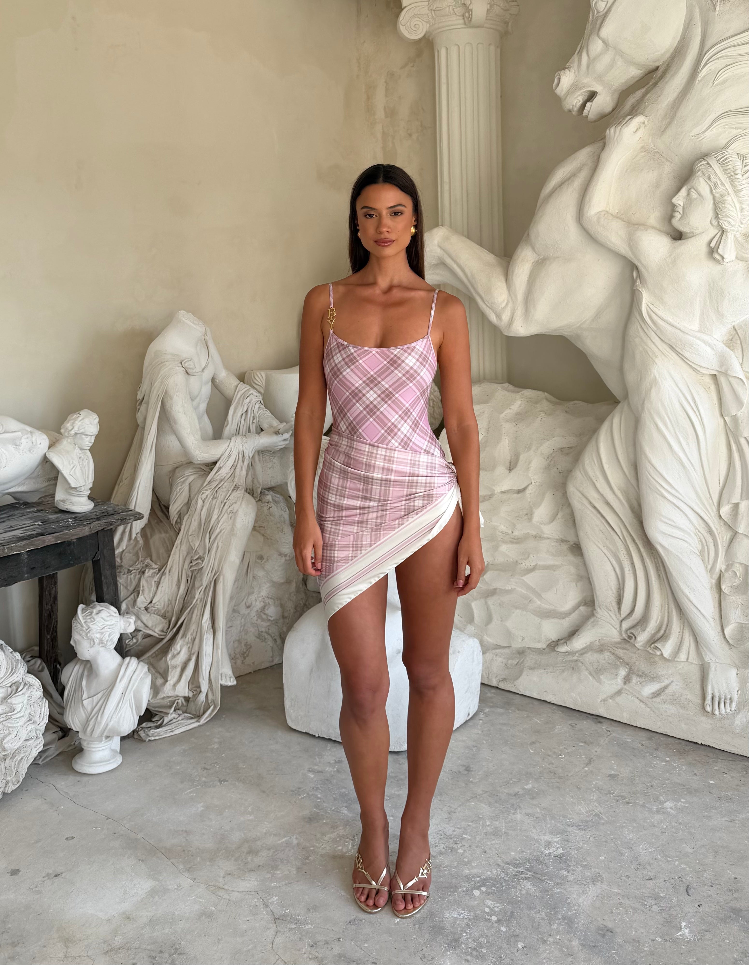 The Cerel Scarf in Plaid de Romance is a timeless styling piece inspired by soft, romantic vintage prints. Crafted in a lightweight, fluid fabric, it features the collection’s signature plaid pattern framed by a delicate border for a refined finish. Designed to be worn in multiple ways, Cerel can be styled around the waist as a sarong, tied as a top, wrapped in the hair, or worn as a classic scarf. An effortless accessory that adds a gentle touch of color and texture to any JE T’AIME look.
