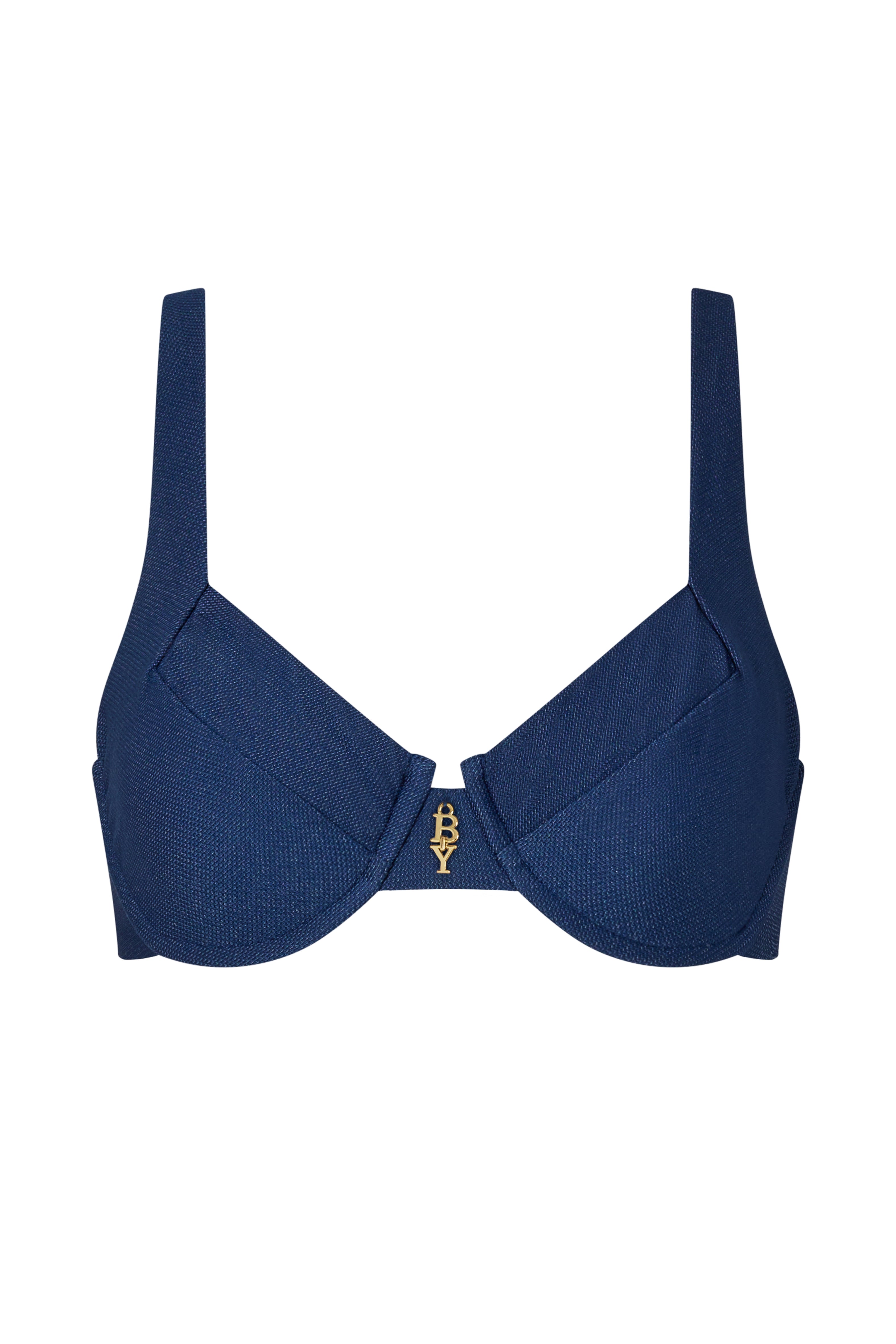 The Reve Top in Vintage Denim is a balconette style swim top inspired by classic lingerie construction. Featuring textured denim-look outer fabric with smooth signature printed lining, this top is shaped with underwire cups that offers support and structure while maintaining a refined, feminine feel. Slim adjustable shoulder straps are paired with a newly designed back featuring a double-hook closure and adjustable sliders, allowing the fit to be tailored precisely to your body. Finished with a delicate golden BY detail at the center front, Reve balances romance with structure, a polished piece designed to elevate swim into styling.